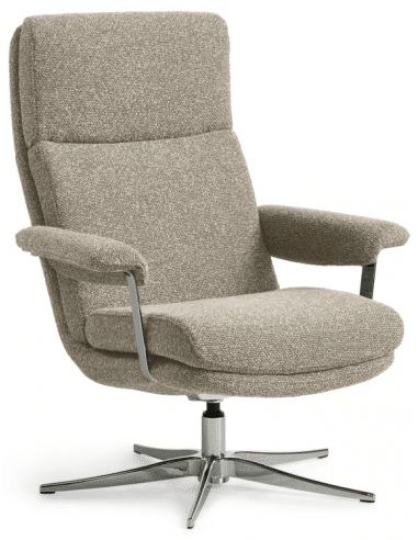 Connor lænestol med vippefunktion og drejefod, fremstillet i et design af kromlakeret stål og beige polyester. Stolen måler 96,5 cm i højden over ryggen og med siddehøjde på 42,5 cm.